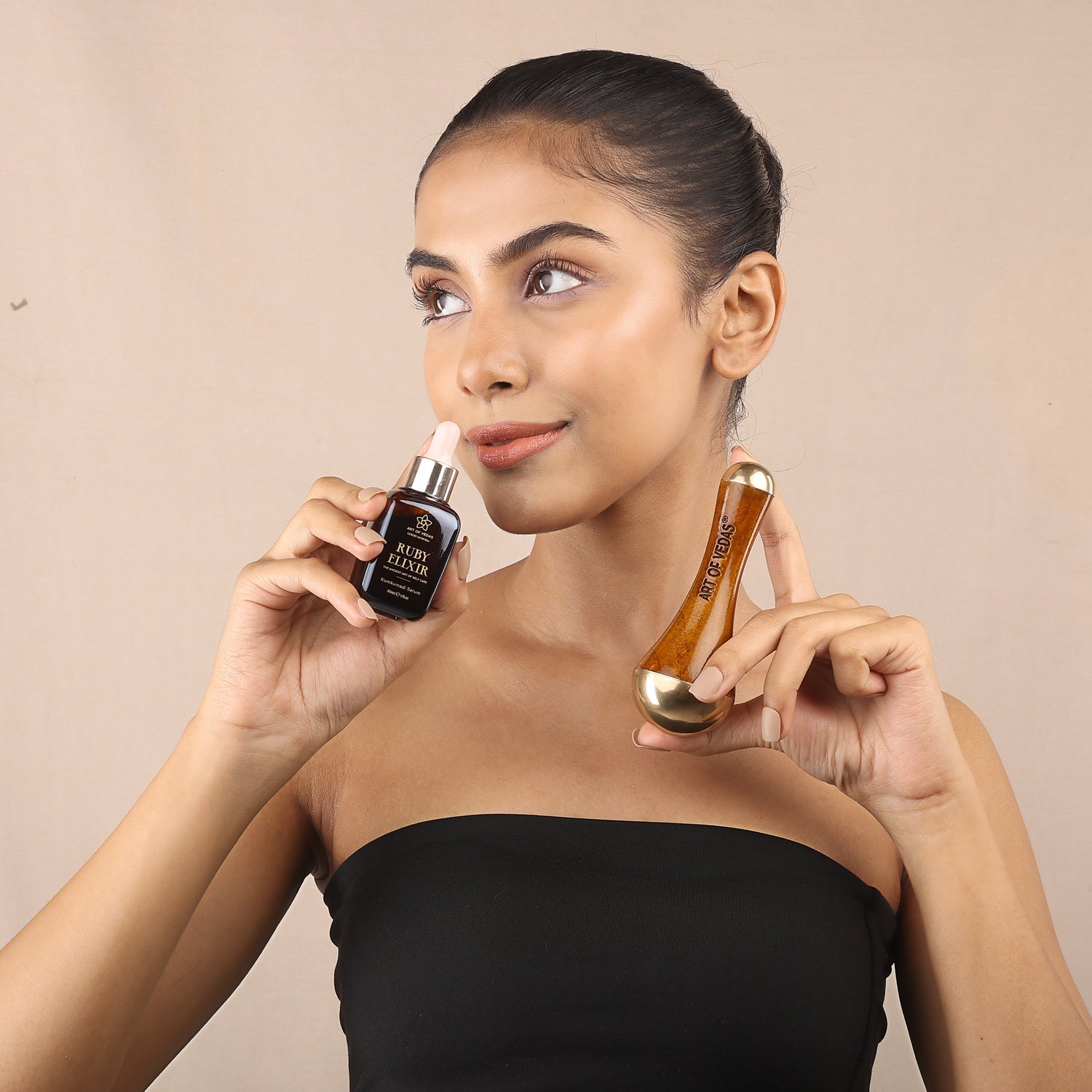Experience the timeless Ayurvedic practice of self-facial Abhyanga with the Kumkumadi Abhyanga Ritual Kit, a luxurious duo crafted for radiant, balanced skin. This kit includes the Ruby Elixir Kumkumadi Serum, a powerful blend of saffron and Ayurvedic herbs renowned for their ability to illuminate the skin, and the Double-Sided Kansa Wand, designed to enhance circulation and restore energetic balance.