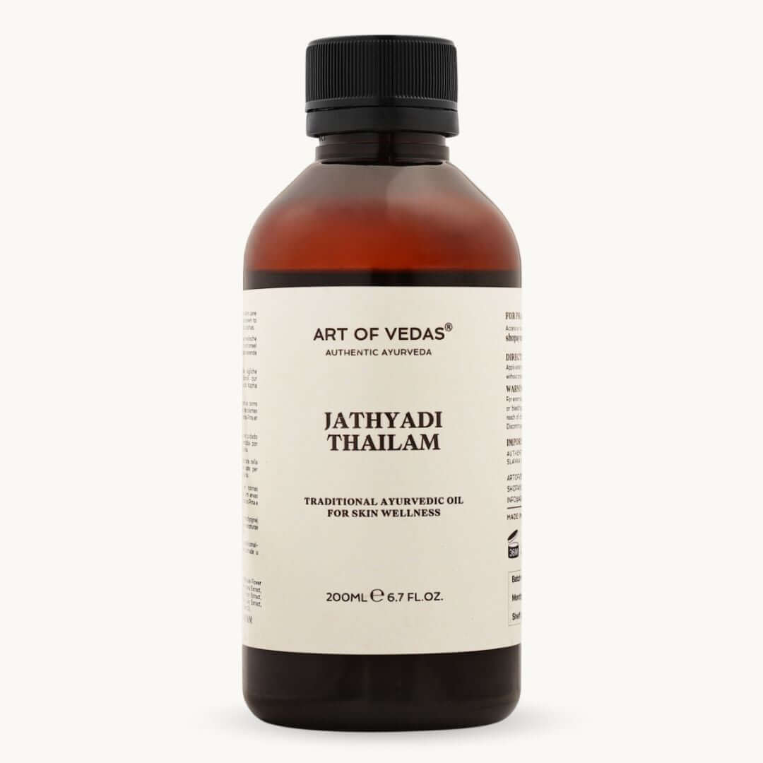 Jathyadi Thailam is a traditional Ayurvedic oil for external use as part of wound care and general wellbeing practices. It is NOT a medicine, has NOT been evaluated by regulatory authorities as a medical treatment, and is NOT intended to diagnose, treat, cure, or prevent any disease or medical condition.